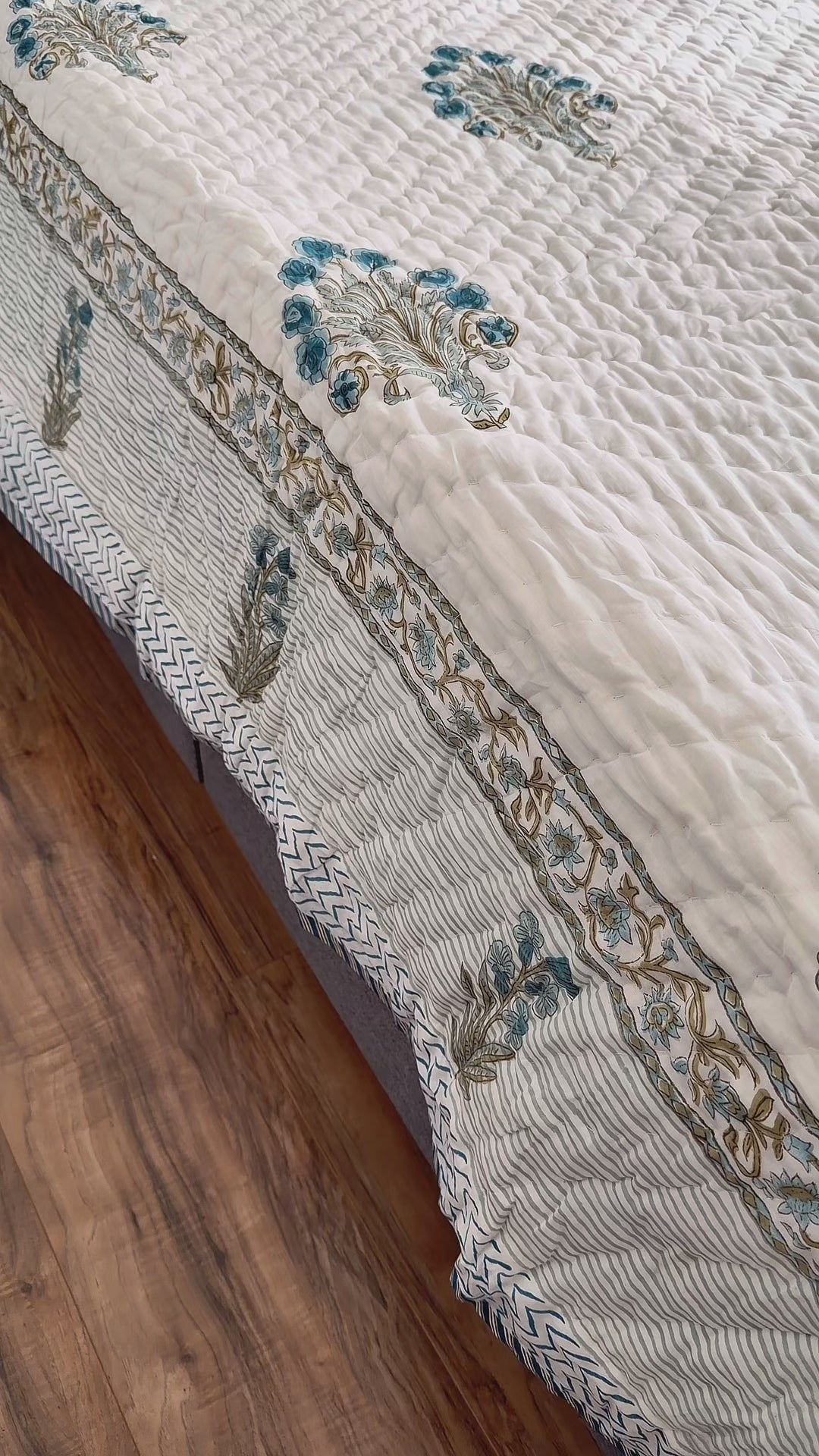 Adorned with delicate blue floral buta motifs and a timeless hand-printed border, this quilt reflects classic Indian artistry with serene elegance. Crafted in soft cotton and hand quilted for breathable comfort, it brings refined charm to both modern and traditional bedrooms.