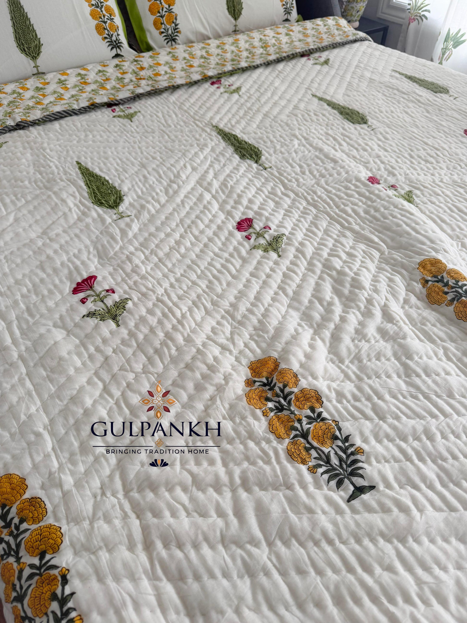 Marigold Garden Hand Block Printed Cotton Quilt | Gulpankh Canada